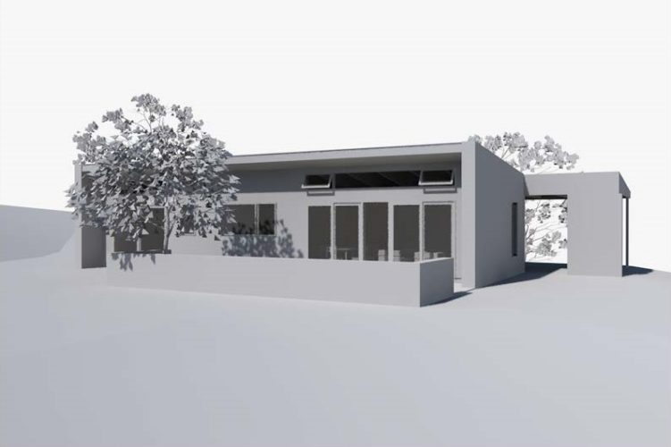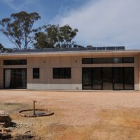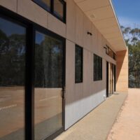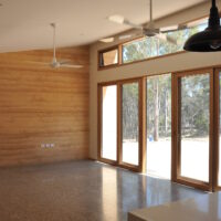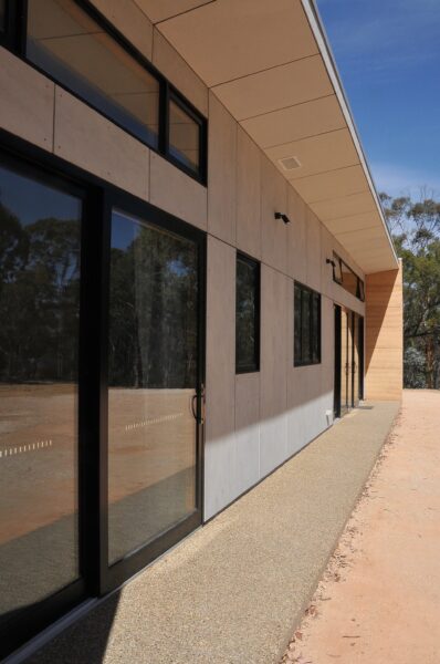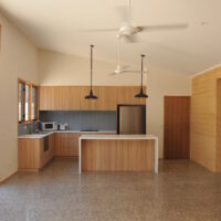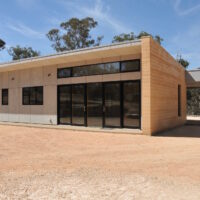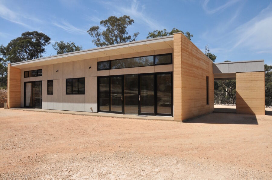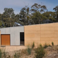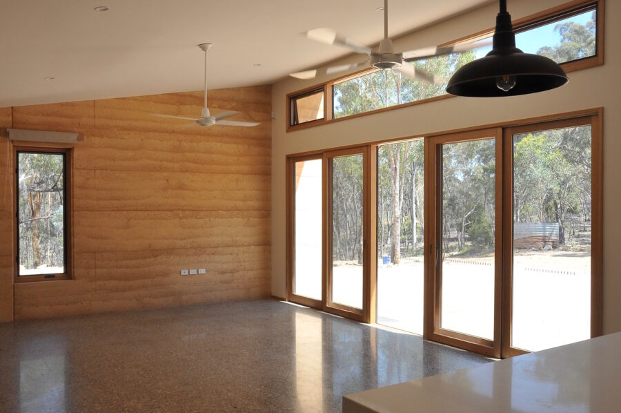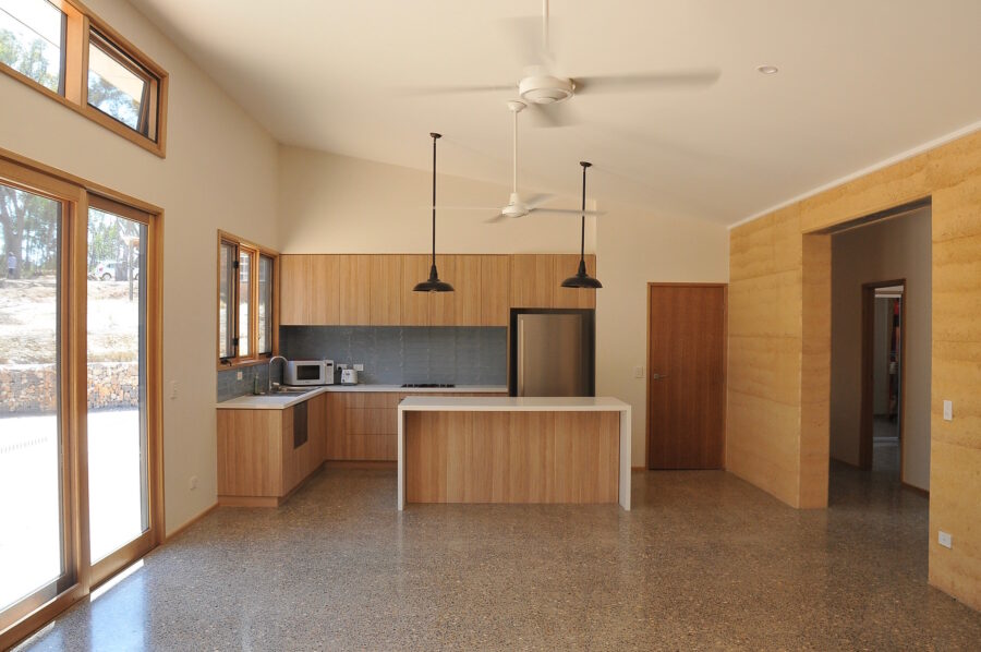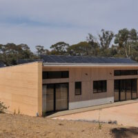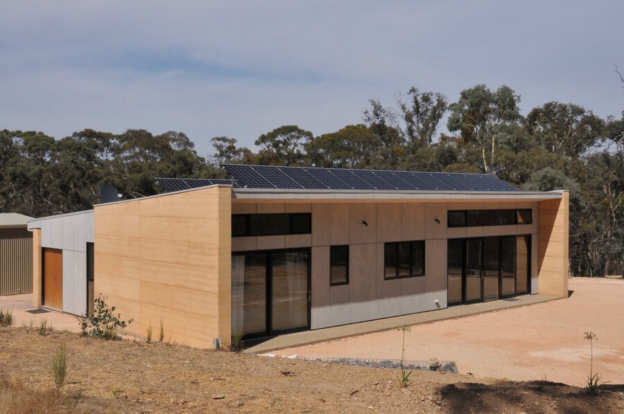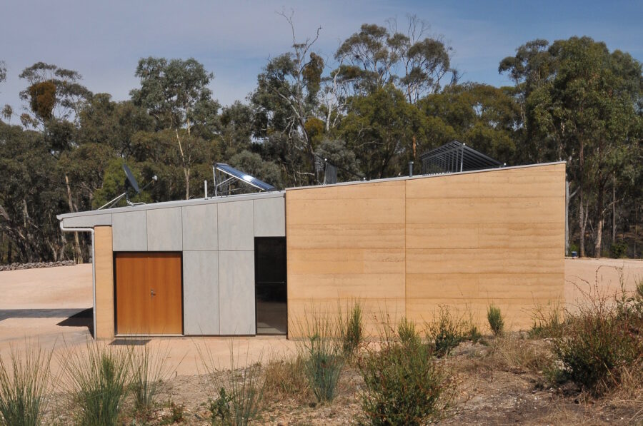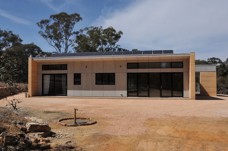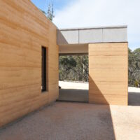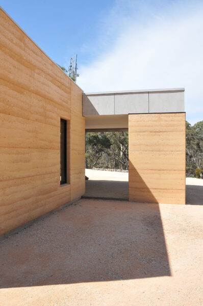 This house is located on a large treed block north of Castlemaine in Central Victoria. The site has been re-worked to create a building platform that allows the house to orient to an open terrace to the north. The living zones and main bedroom all share the north solar access and views to the terrace. The house produces its own water and electricity with an off grid PV system and reticulated rain water collection and storage system. The house has been designed for a bushfire attack level of BAL 40. The house is constructed using thermal mass to moderate summer and winter temperature extremes. Massive insulated rammed earth walls enclose the major living spaces and are used define the primary circulation. Materials are used in their raw state with polished concrete, rammed earth and compressed fiber cement sheet.