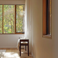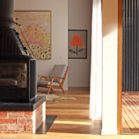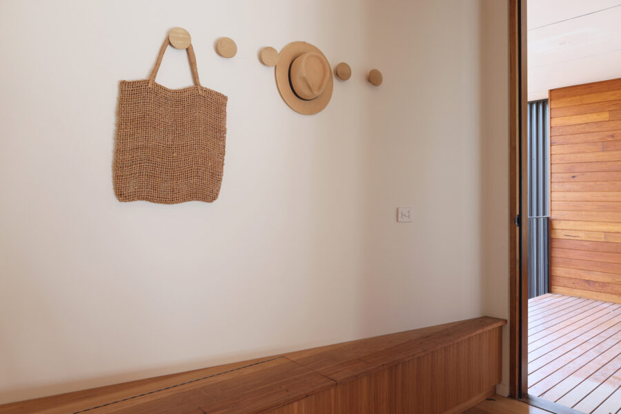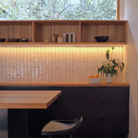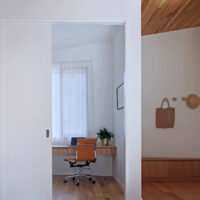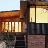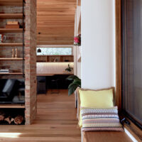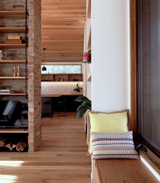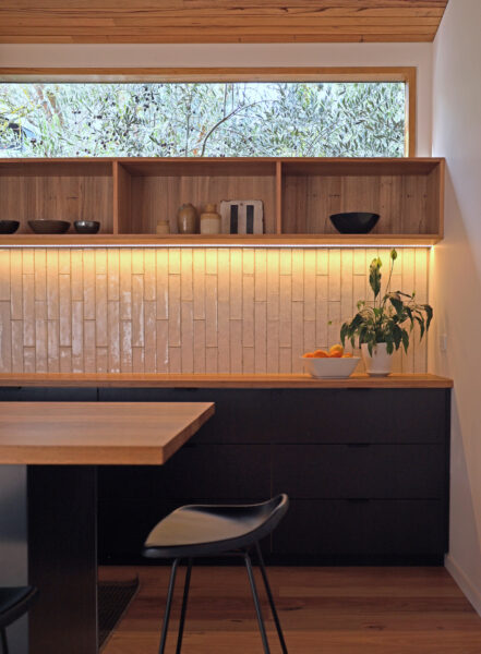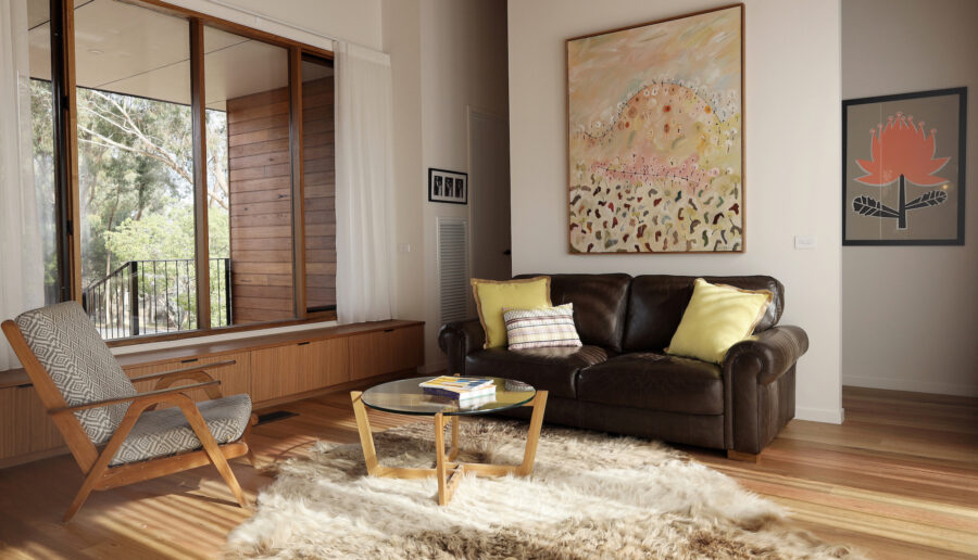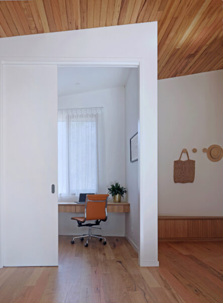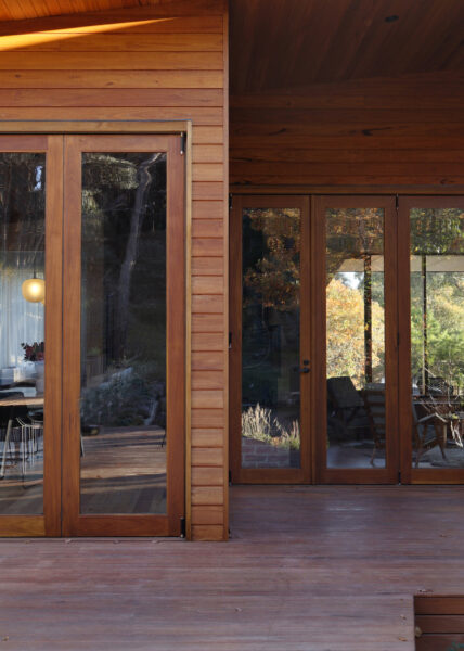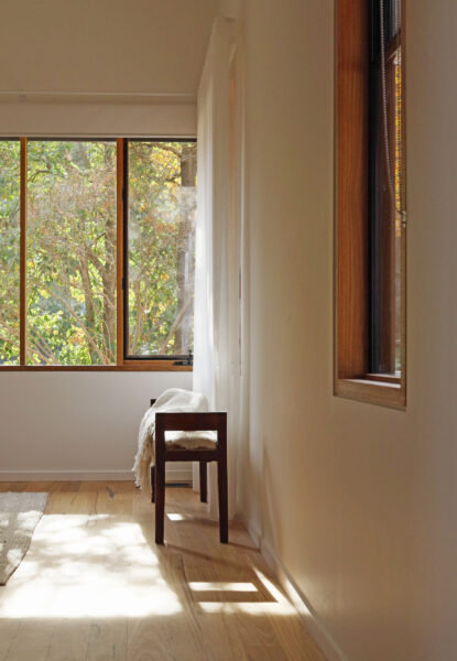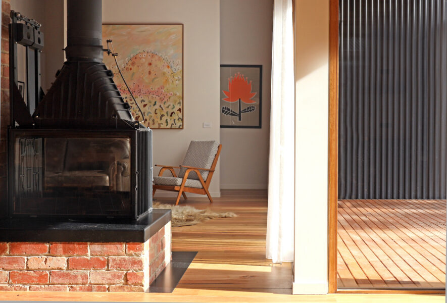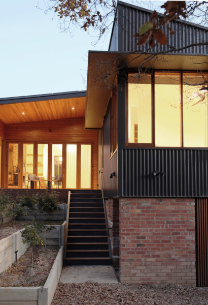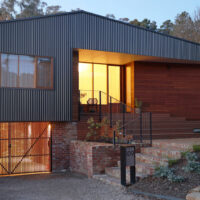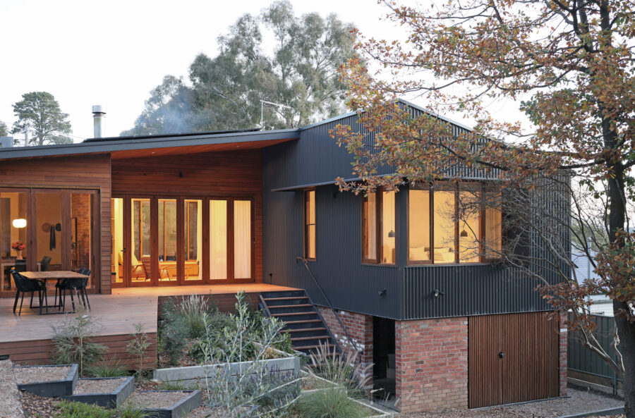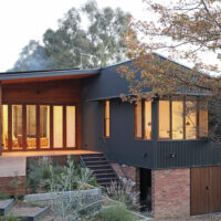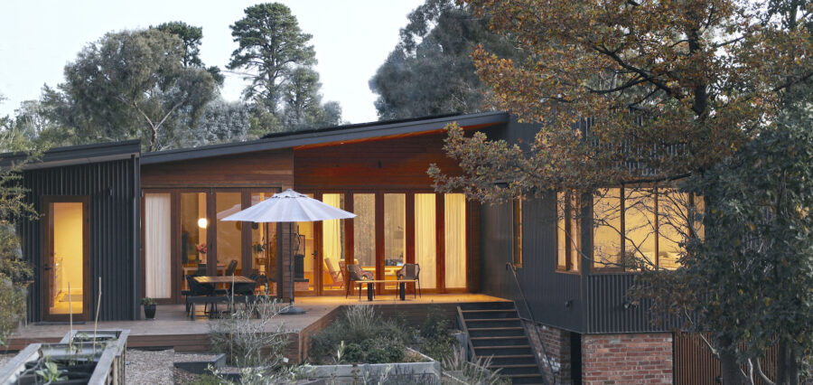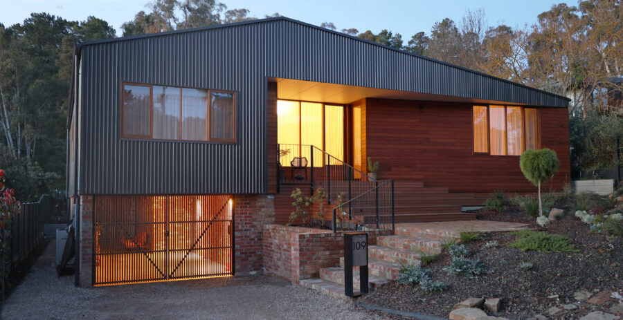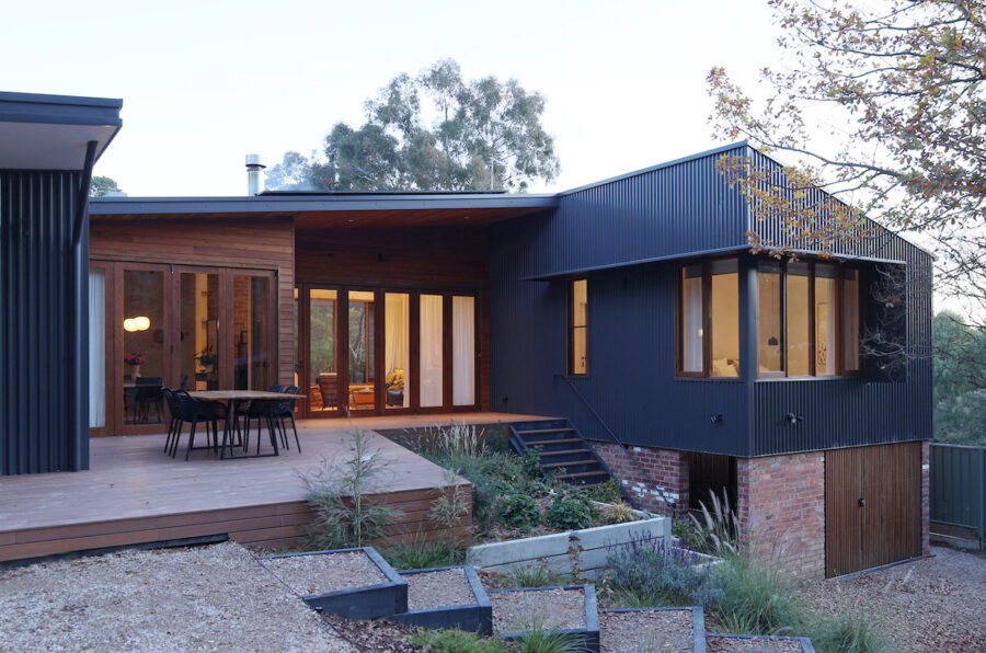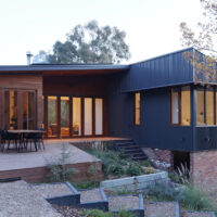 This house is located within an easy walk of central Castlemaine with a unique bush outlook to Kalimna Park. The site strategy involves placing the house on a single level taking advantage of the cross fall to create a carport under the western bedroom wing accessed via the existing crossover and driveway. A retaining wall at eastern side of the driveway creates the space for steps and a landscaped platform to access the entry deck. The placement of the living area in relation to entry deck and entry sequence creates connections to the street and the activity of the street as well as the northern deck. Landscaped terraces mediate the level change between north deck and natural ground to open the living, dining and kitchen zones to the garden to the north and views of Kalimna Park.