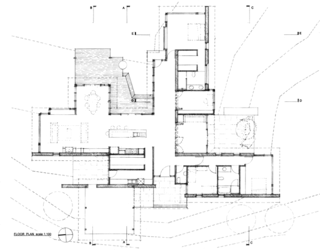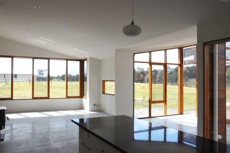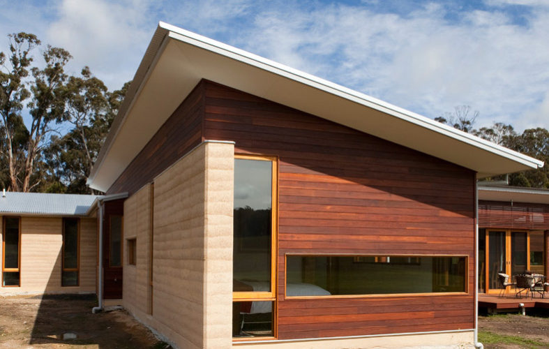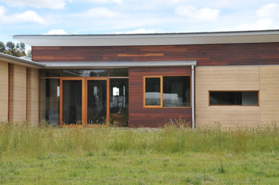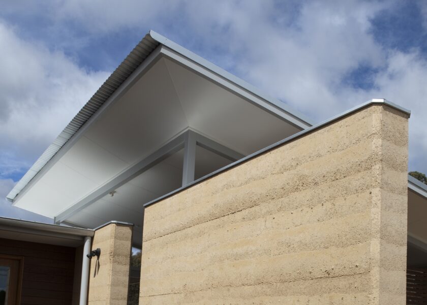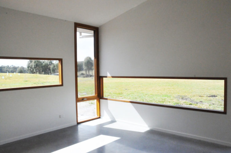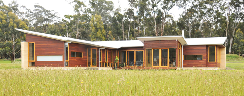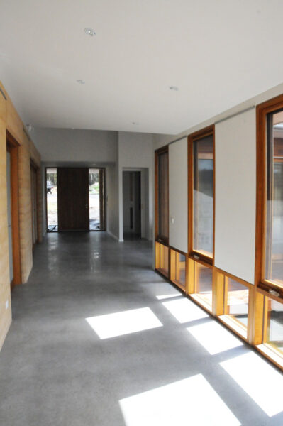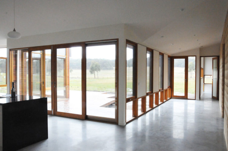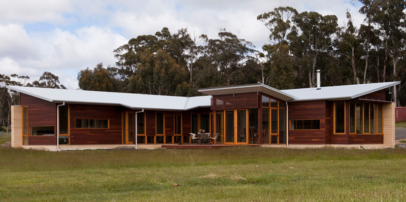 The house is located near the township of Woodend, on a gentle east facing slope overlooking the Slatey Creek valley, with longer views to Mount Macedon. The site provides more intimate views to the south and south east towards stands of remnant vegetation. The project brief is for a family home that harnesses the site’s potential for minimal environmental impact. The floor plan developed around the requirement for sheltered outdoor areas in both summer and winter. The main living areas including retreat, study and main bedroom wrap in an ‘L’ around a sheltered outdoor area with both northerly aspect and views to the east. The bedroom wing spins off the entry to create a sheltered southerly terrace. The main living areas have long views through the retreat to the south terrace and beyond. The house utilizes insulated rammed earth and concrete slab construction to create internalised thermal mass in order to moderate the daily swings in temperature. Solar control is achieved using eaves and timber batten sun screens.  The materials used in this house are expressed in their raw state; rammed earth, polished concrete floors, timber and zincalume steel make up the pallet.